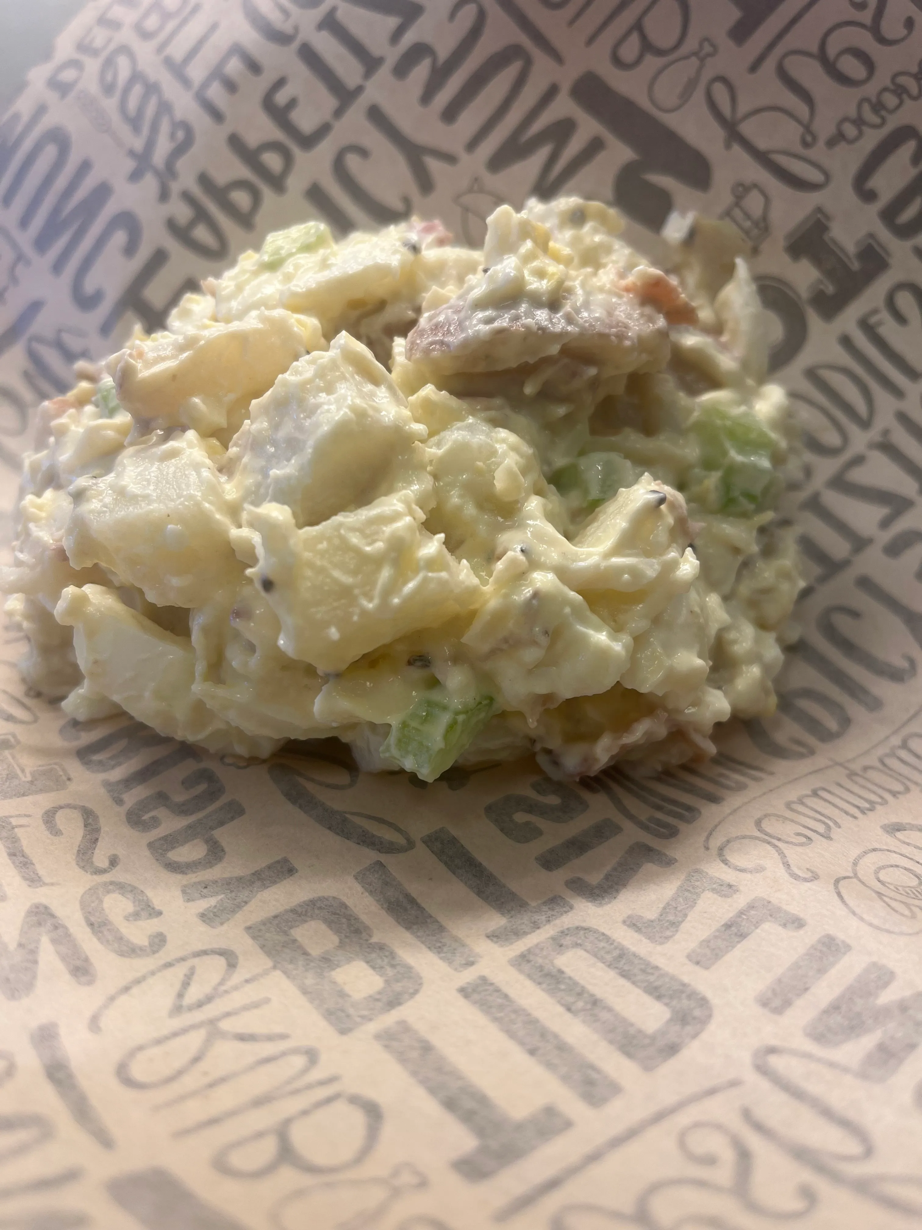 Diced Red Potatoes, Bacon And Celery Mixed Together With Seasonings, Mayo And Finely Chopped Egg.