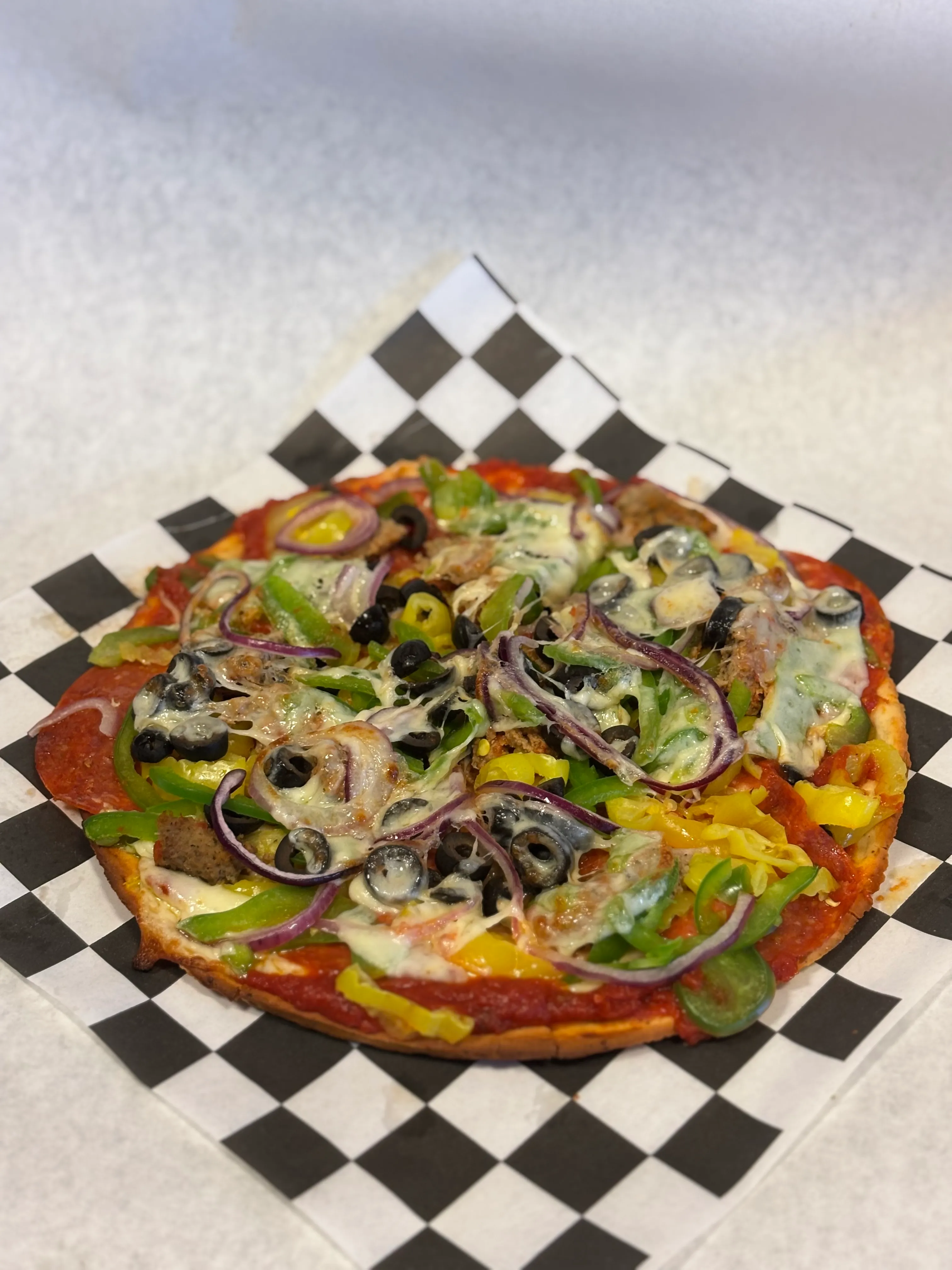 Banana Peppers, Green Pepper, Black Olives, Red Onion, Tomato